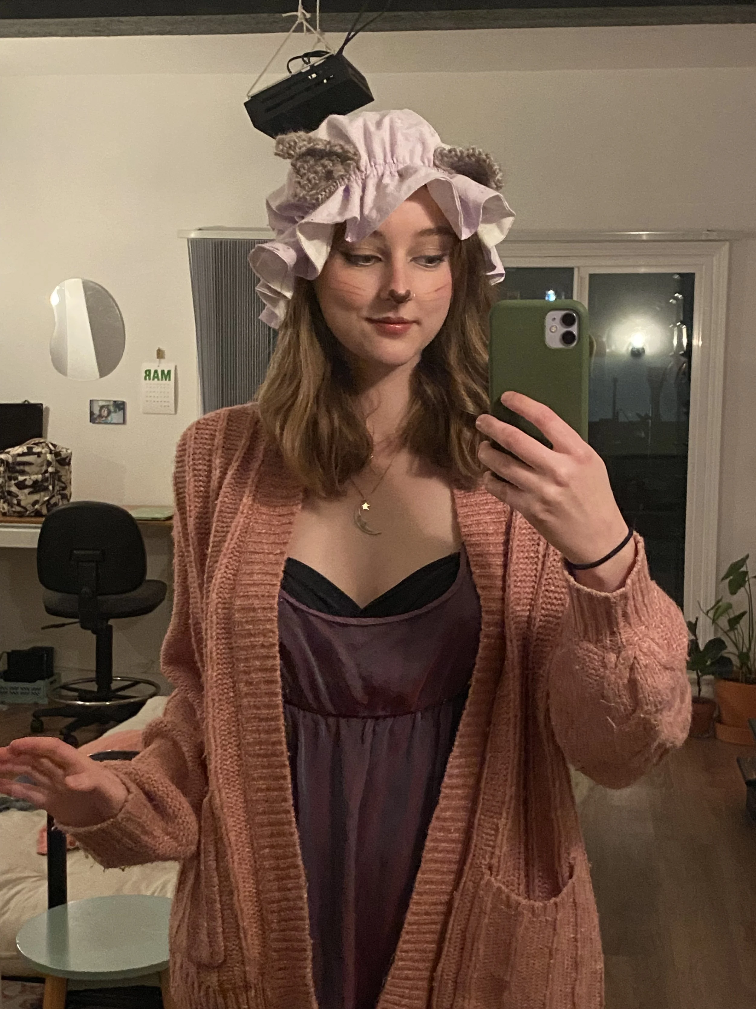 Crocheted shrek hat and wolf ears. Sewed a mop cap from an old blouse. Completed the look with a vintage nightgown from my collection.
